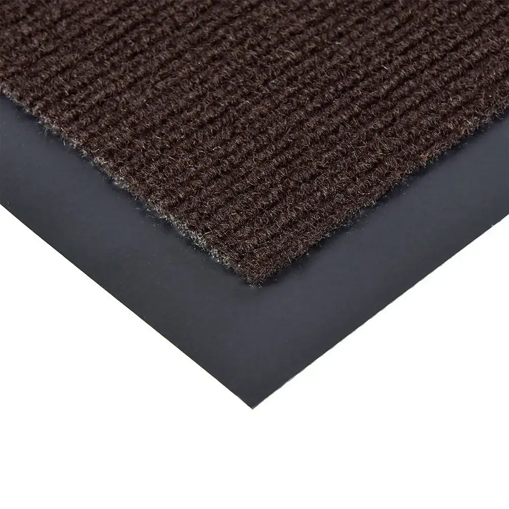 Коврик выполнен из двухслойного материала: верхний слой - ворсистый, темно-коричневого цвета, а нижний слой - гладкий, черного цвета, что обеспечивает надежное сцепление с поверхностью. Его рифленая текстура не только привлекает внимание, но и эффективно очищает обувь от грязи и влаги. Размеры коврика 60х90 см делают его универсальным для любого входа.
