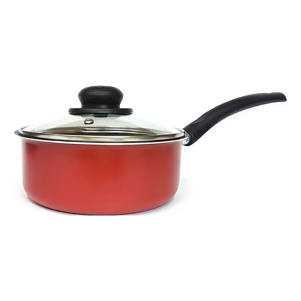 Алюминиевый ковш со стеклянной крышкой сочетает удобство и функциональность. Компактные размеры (18 см диаметр, 11 см высота) экономят место на кухне, а антипригарное покрытие гарантирует лёгкое приготовление без пригорания.