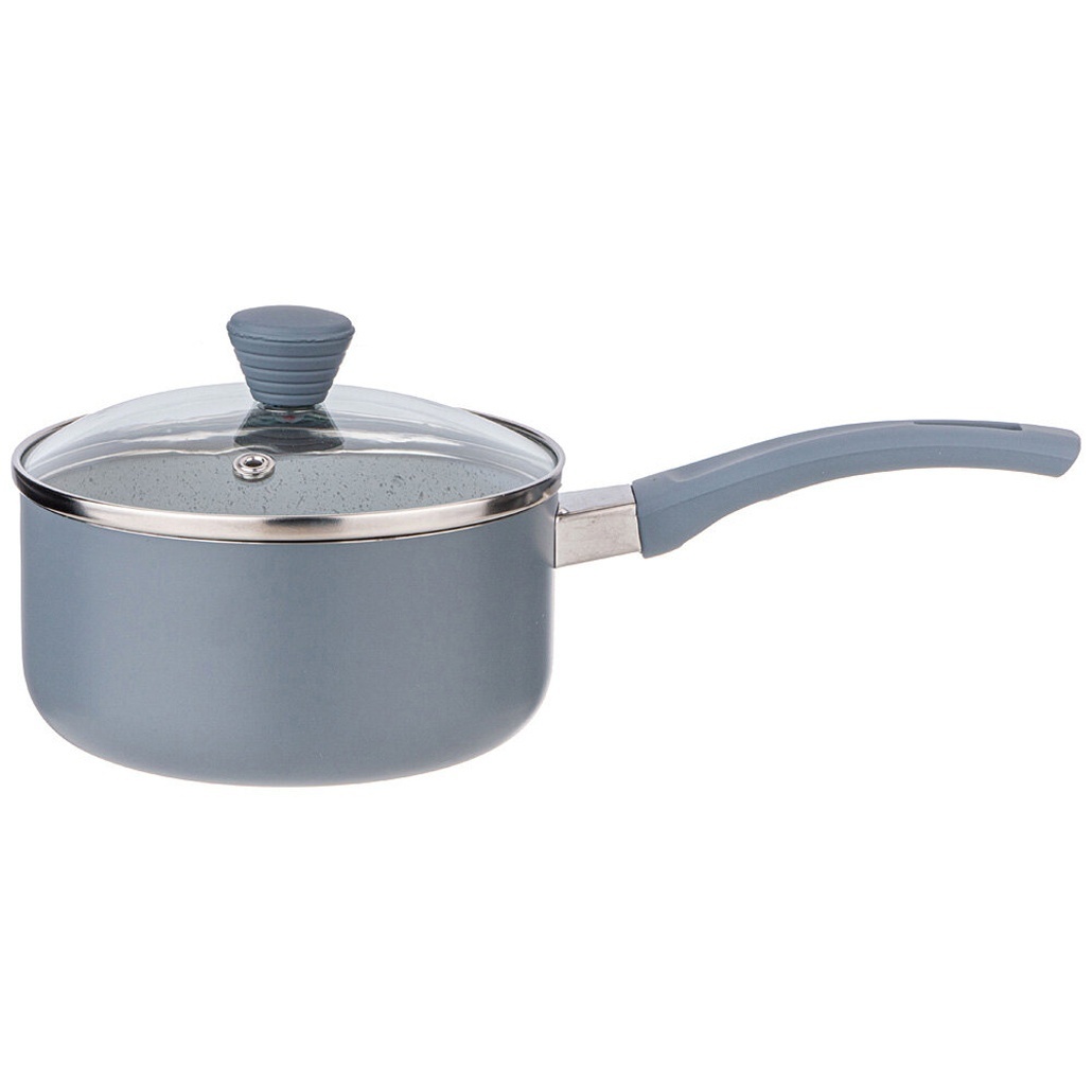 Материал корпуса — алюминий толщиной 2 мм, внутренняя поверхность светло-серая с мелкими вкраплениями, устойчива к воздействию высоких температур. Крышка выполнена из прозрачного жаропрочного стекла с металлическим ободом и удобным рифлёным держателем в тон корпусу. Ручка длинная и слегка изогнутая, закреплена металлическим элементом для прочности. Идеален для ежедневного использования дома и на даче.