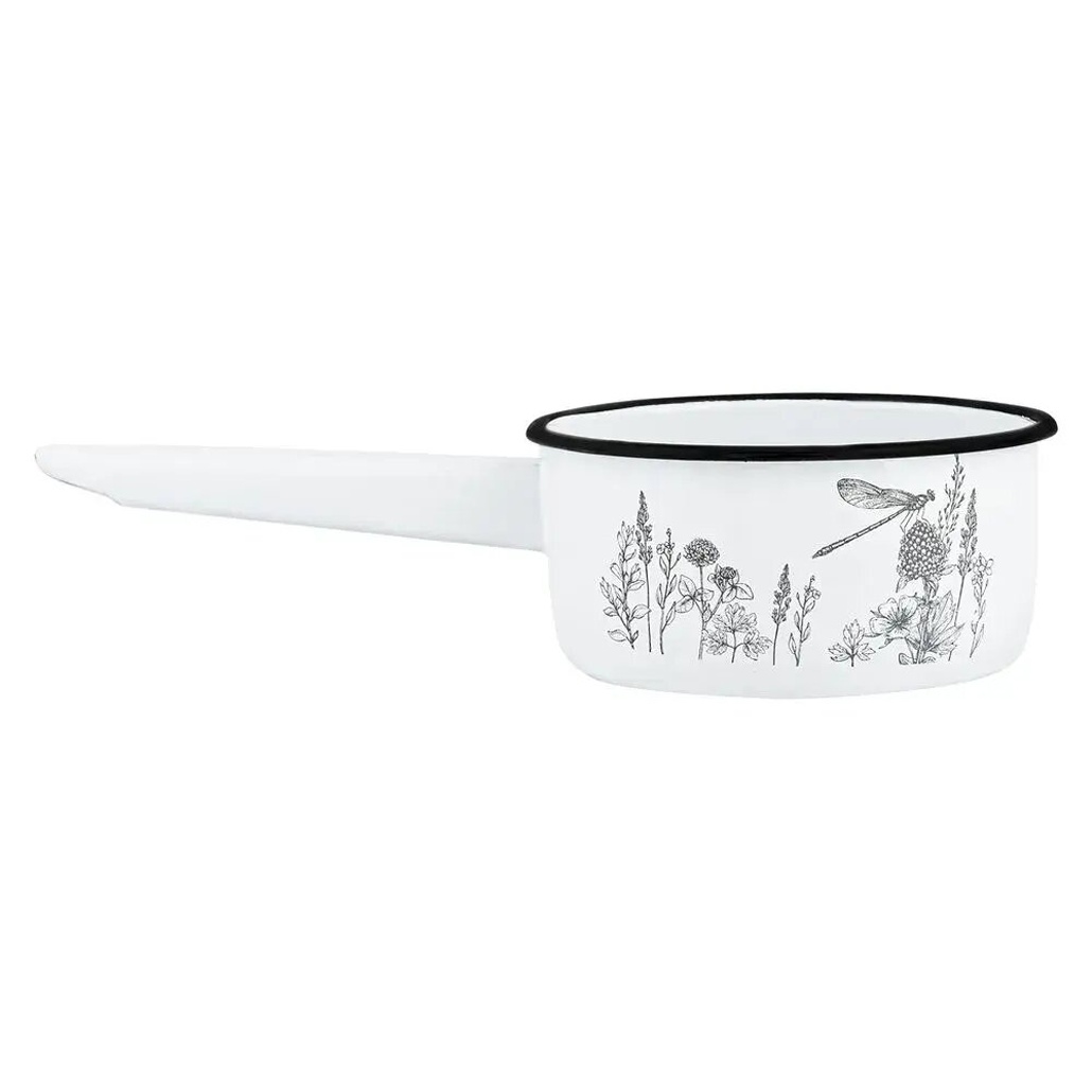 Ковш изготовлен из металла с эмалированной поверхностью, цилиндрическая форма с ровными стенками гарантирует равномерный прогрев. Белый цвет с черной окантовкой по верхнему краю, рисунок на внешней стороне. Ручка эргономична и позволяет комфортно переливать содержимое. Товар подойдет для ежедневного использования и станет вашим помощником на кухне.