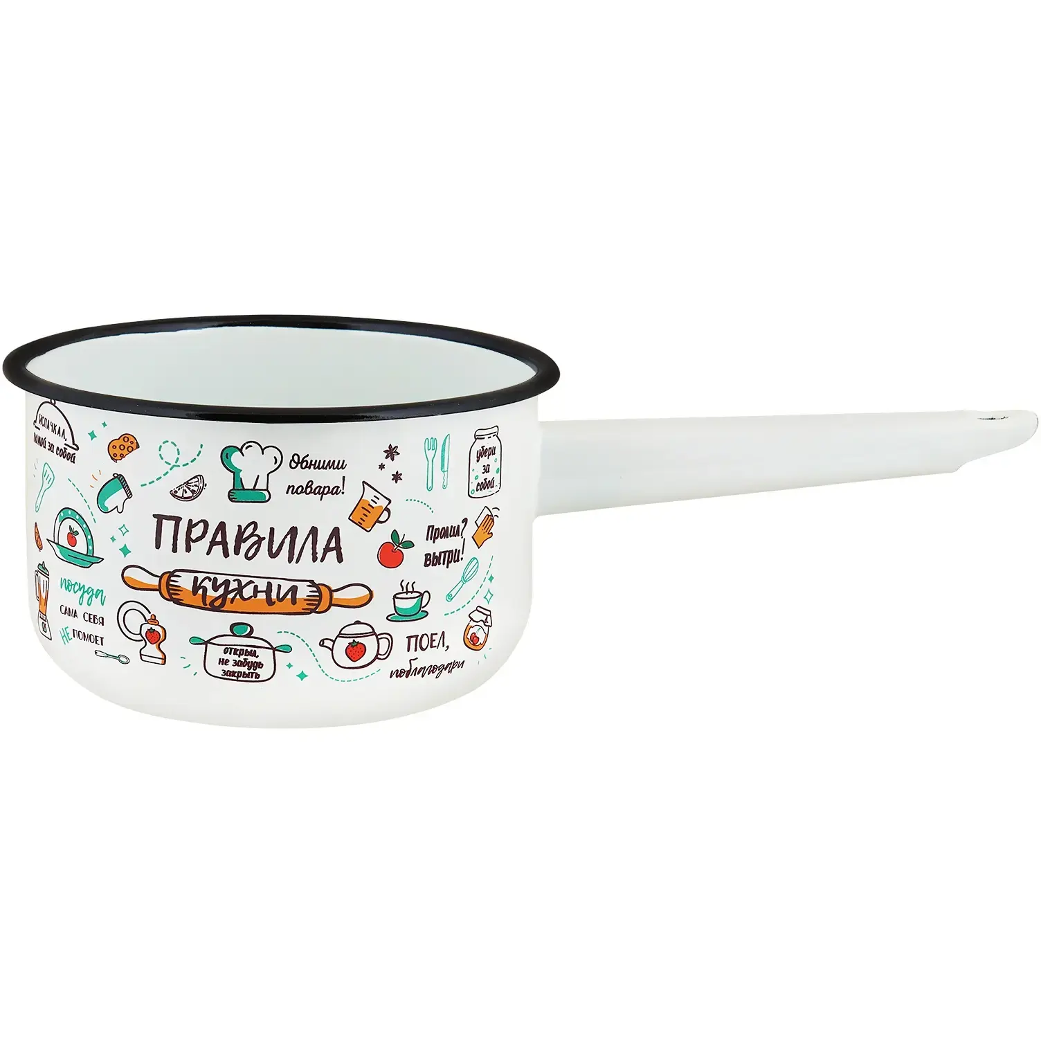 Эмалированный ковш «Правила кухни» сочетает практичность и оригинальный дизайн. Удобная форма и продуманные детали сделают приготовление соусов, каш и гарниров комфортным, а яркие надписи добавят настроения вашему кухонному пространству.