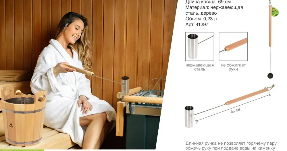 Ковш выполнен из нержавеющей стали и дерева, что обеспечивает его прочность и долговечность. Объем 0,23 л позволяет удобно использовать его для различных банных процедур. Длина 69 см делает его удобным для манипуляций в сауне. Этот ковш станет отличным дополнением к вашему банному инвентарю и поможет создать атмосферу уюта и комфорта.
