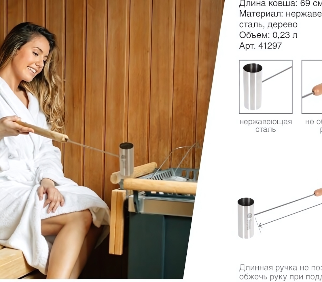 Погрузитесь в атмосферу настоящей бани с нашим ковшом из нержавеющей стали. Этот аксессуар не только удобен в использовании, но и добавляет нотку стиля в ваши банные процедуры. Длина 69 см и объем 0,23 л делают его идеальным для подачи воды на камни, что создаёт необходимый пар для полноценного отдыха.