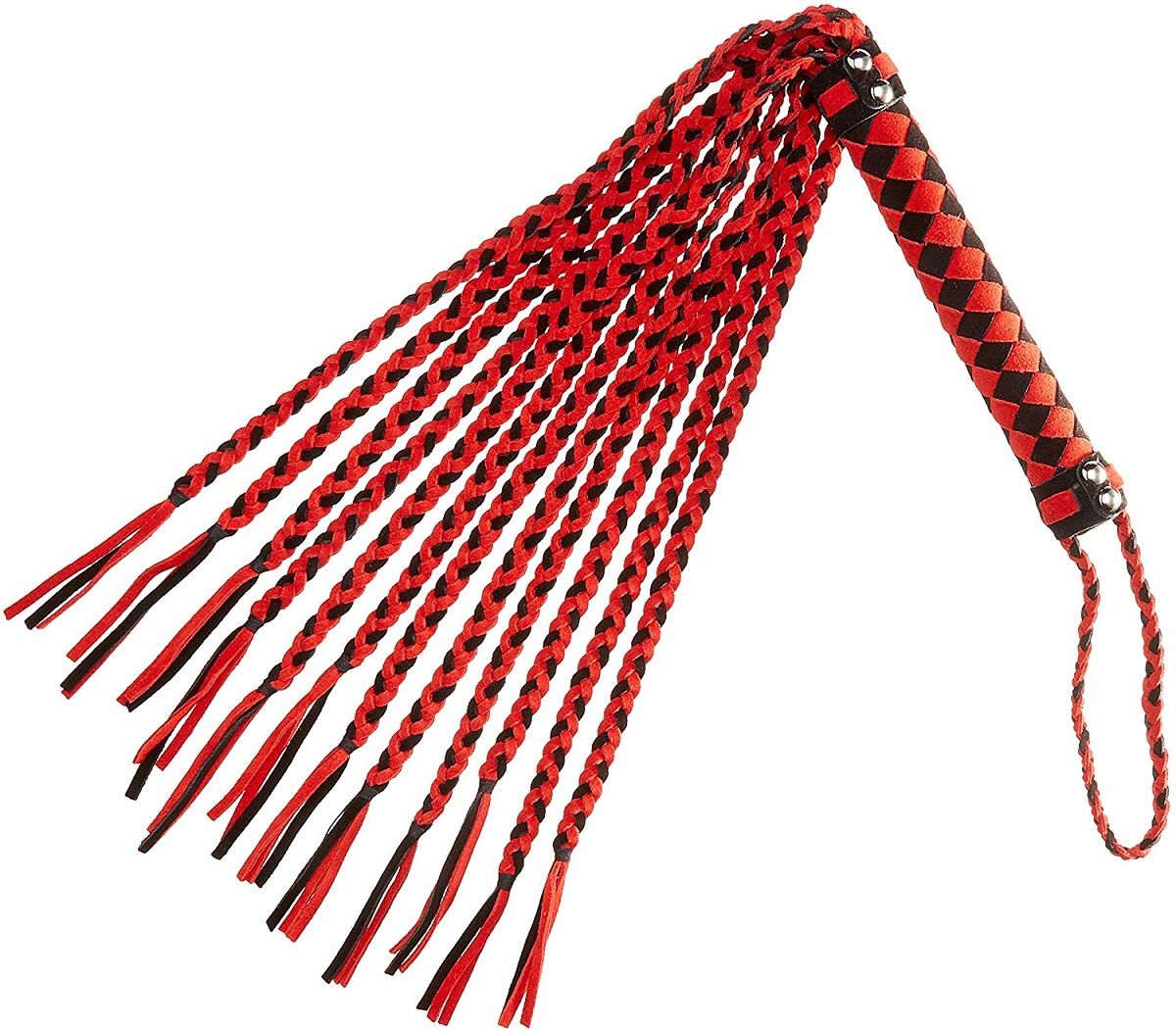 - Качественные материалы: Основной материал — натуральная кожа, которая при должном уходе долго сохраняет свой внешний вид и тактильные свойства. Сочетание насыщенного красного и глубокого чёрного цветов делает плеть визуально привлекательным аксессуаром.