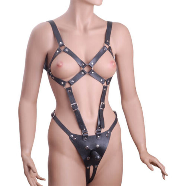 Боди-харанес эротический женский из натуральной кожи, черный, универсальный размер 40-48, комплект со стержнем