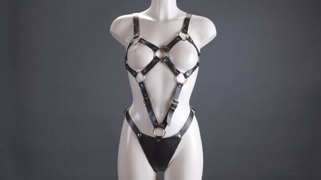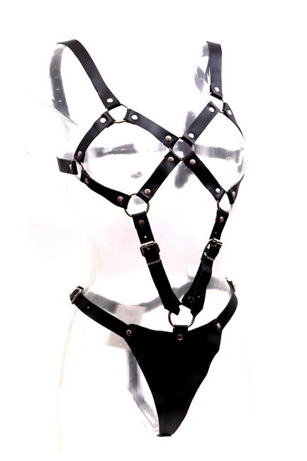 Боди кожаное в стиле БДСМ, черный с серебром, натуральная кожа, размер SM (42-44)