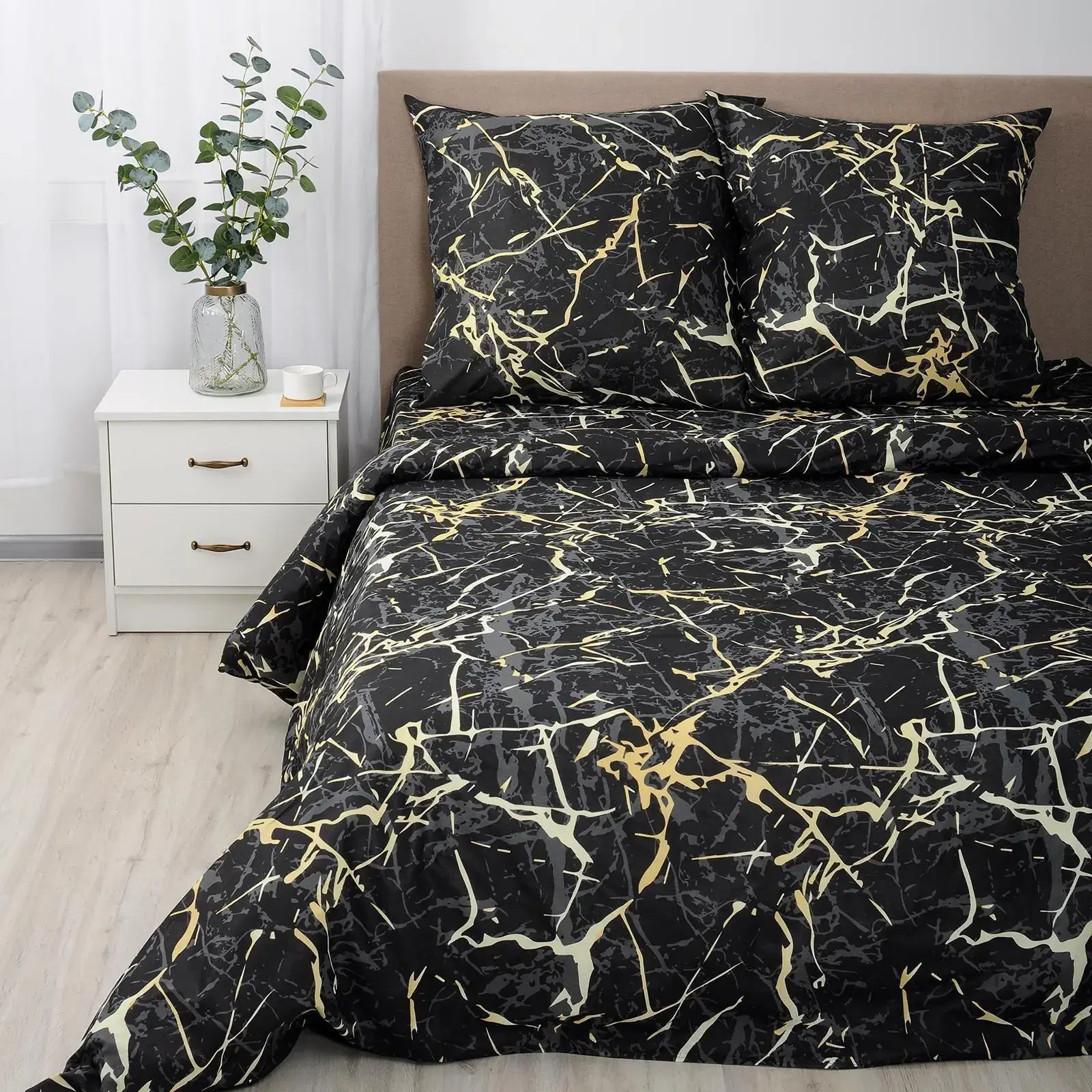 Комплект постельного белья поплин 2,0 сп. «Павлайн» Sweet Sleep с мраморным узором — это идеальное решение для создания уютной атмосферы в вашей спальне. Благодаря высококачественному поплину, этот комплект обеспечивает невероятный комфорт и приятные ощущения во время сна. Абстрактный рисунок в черных, золотистых и серых тонах добавляет элегантности и стиля, делая вашу спальню более привлекательной.