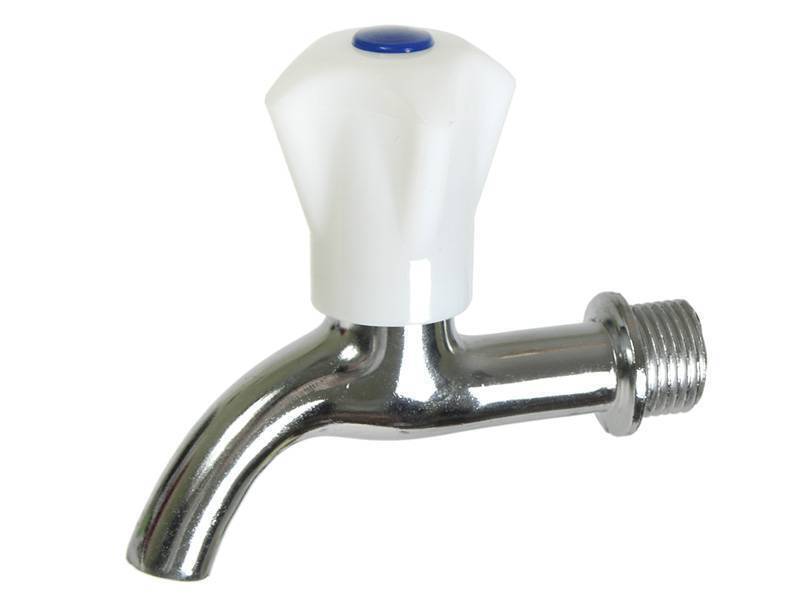 Кроме того, данный кран обладает изогнутой формой с выпуклым носиком, что удобно для наполнения емкостей или использования в различных сантехнических системах. Белая пластиковая ручка с голубой кнопкой обеспечивает комфортное управление и контроль подачи воды. Хромированная поверхность защищает от коррозии, а прочный металл гарантирует длительный срок службы.