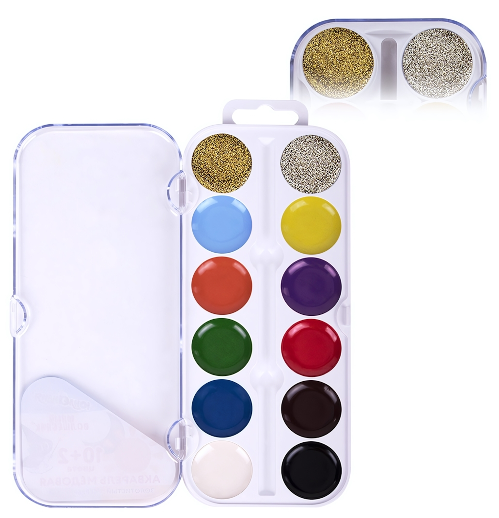 Акварельные краски «Юный волшебник» 12 цветов с блестками, золото/серебро, круглые кюветы, безопасные