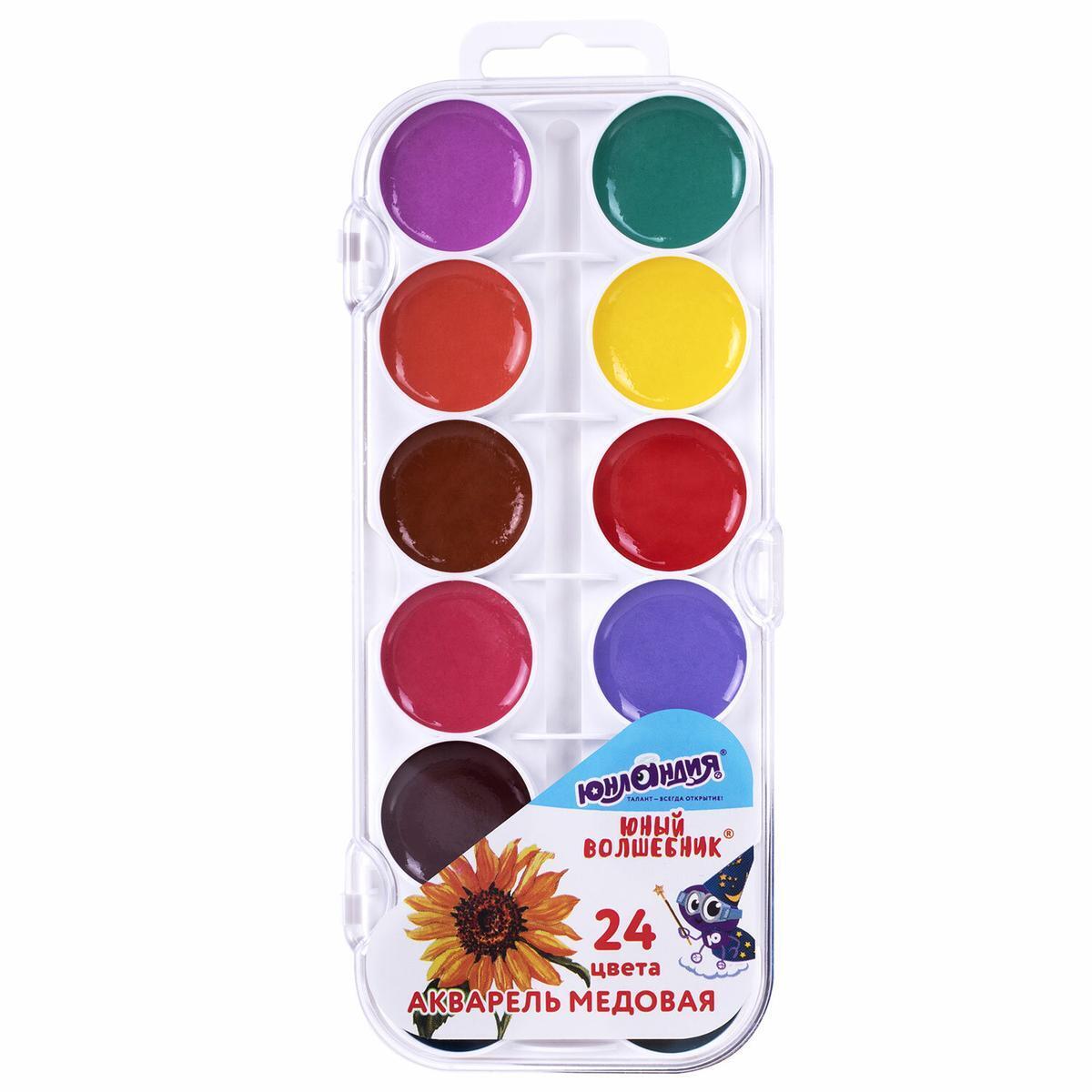 Акварель юный волшебник, 24 медовых цвета, круглые кюветы, пластиковый корпус, удобная крышка