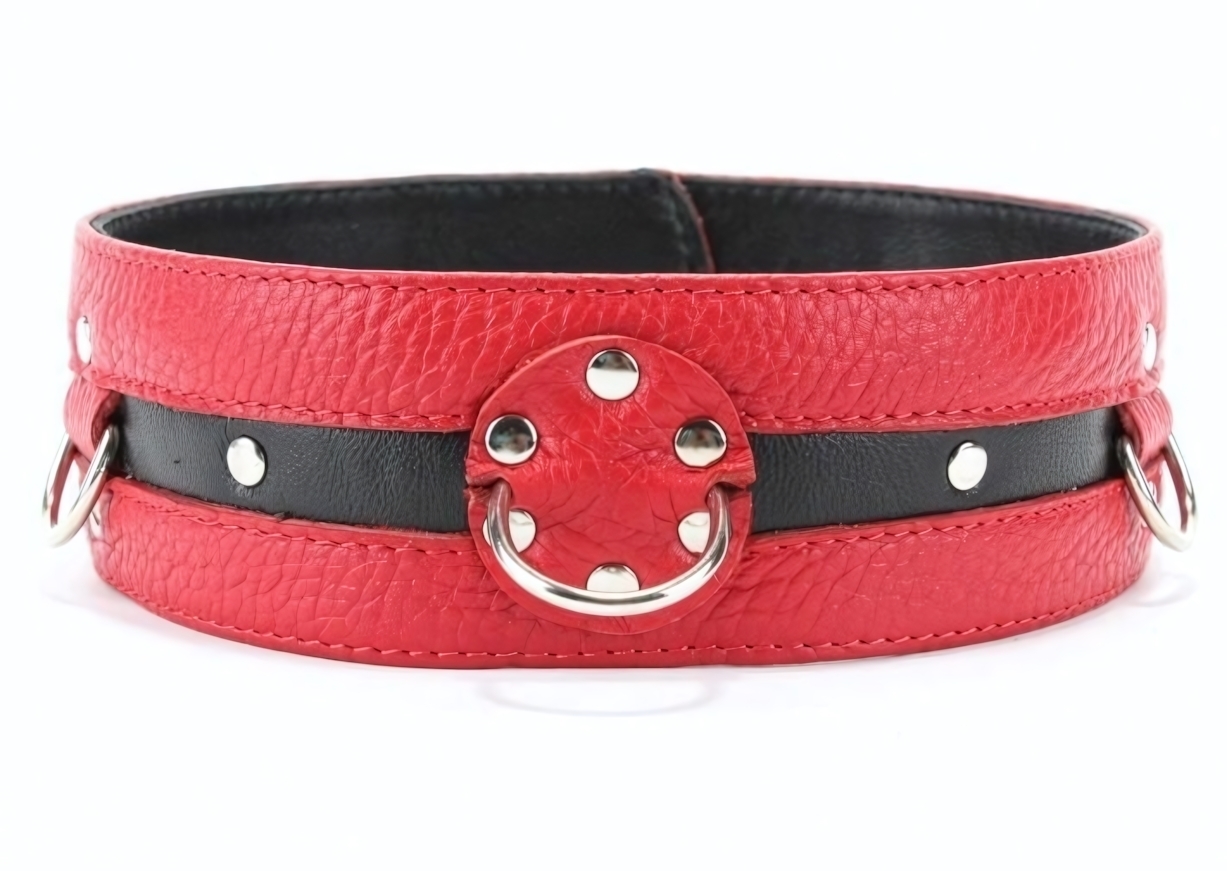 Ширина ошейника составляет 5 см, что делает его заметным аксессуаром, подчеркивающим стиль и уверенность своего владельца. Декоративные заклепки и контрастные вставки из черной кожи создают дерзкий и элегантный дизайн.