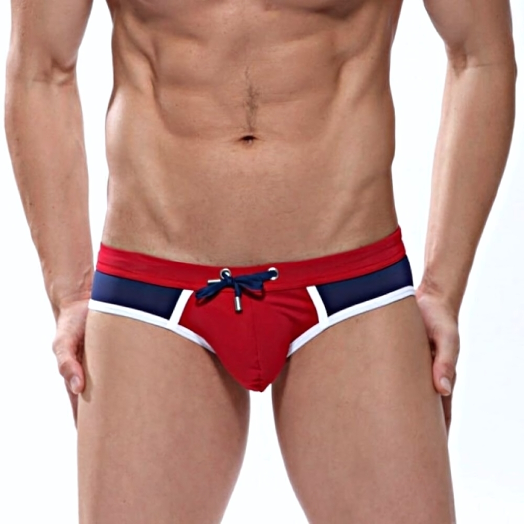 Красно-синие плавки с контрастной отделкой от бренда Romeo Rossi созданы для тех, кто ценит комфорт и современный дизайн. Их узкий крой и эластичный материал обеспечивают идеальную посадку, а завязки на поясе позволяют регулировать размер для максимального удобства.