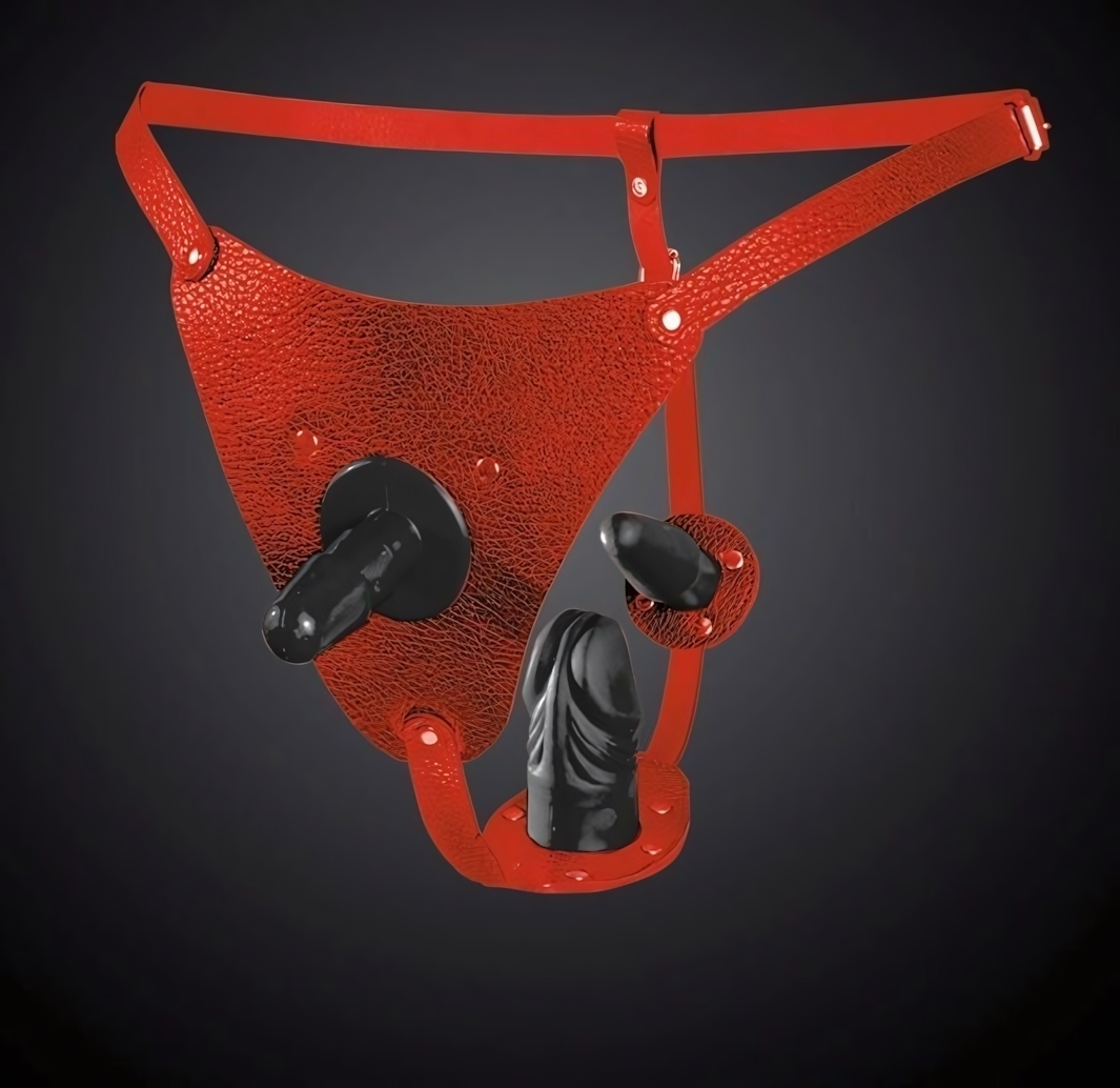 В набор входит фаллоимитатор длиной 8 см (диаметр 3.5 см) и анальная пробка 8.5 см (диаметр 2.2 см). Все элементы крепятся через никелированные соединители, обеспечивающие надёжную фиксацию. Красный цвет изделия подчёркивает страстность образа, а перфорированный ремень на бёдрах добавляет стилистическую завершённость.