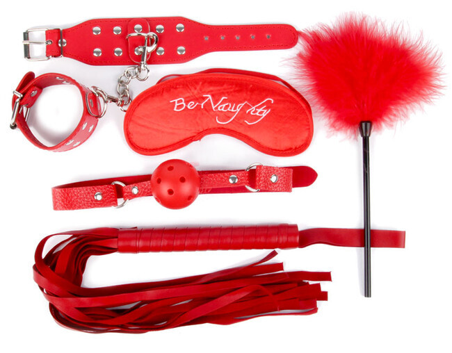 Наручники и кляп имеют элементы из кожи и металла, что придаёт им стильный и привлекательный вид. Маска для глаз из текстиля с надписью 'BeNaughty' добавляет загадочности, а веер с перьями и плётка делают набор ещё более интересным. Размеры и детали каждого предмета идеально подходят для комфортного использования, что делает этот набор отличным выбором для пар, желающих исследовать новые грани своих отношений.