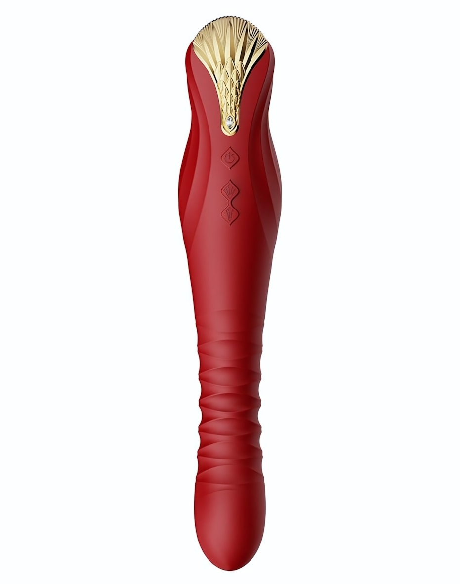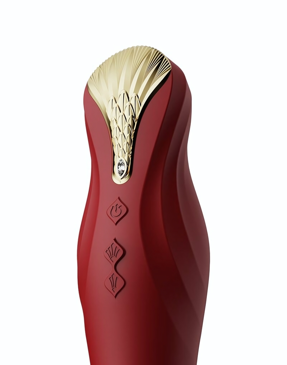 Общая длина устройства составляет 30.2 см, рабочая длина — 15.2 см, диаметр — 4.0 см. Материал — силикон, приятный на ощупь и простой в уходе. Красный цвет и декоративный золотистый элемент с рельефной текстурой придают модели выразительный характер и делают её заметной частью коллекции интимных аксессуаров.
