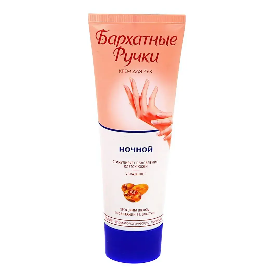 Побалуйте кожу рук эффективным ночным кремом 'Бархатные Ручки', который работает пока вы спите. Формула с протеинами шелка и провитамином B5 глубоко питает и восстанавливает кожу.