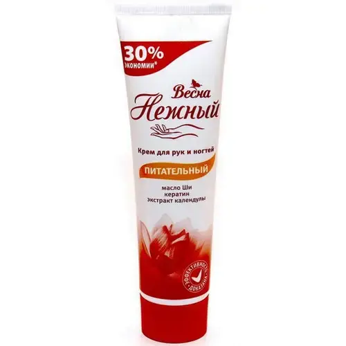 Крем упакован в удобный тюбик объемом 100 мл, что делает его идеальным для использования дома и в поездках. Белая упаковка с яркими красными и оранжевыми элементами привлекает внимание и подчеркивает качество продукта. Не упустите возможность подарить своим рукам заботу и комфорт с кремом 'Весна Нежный'!