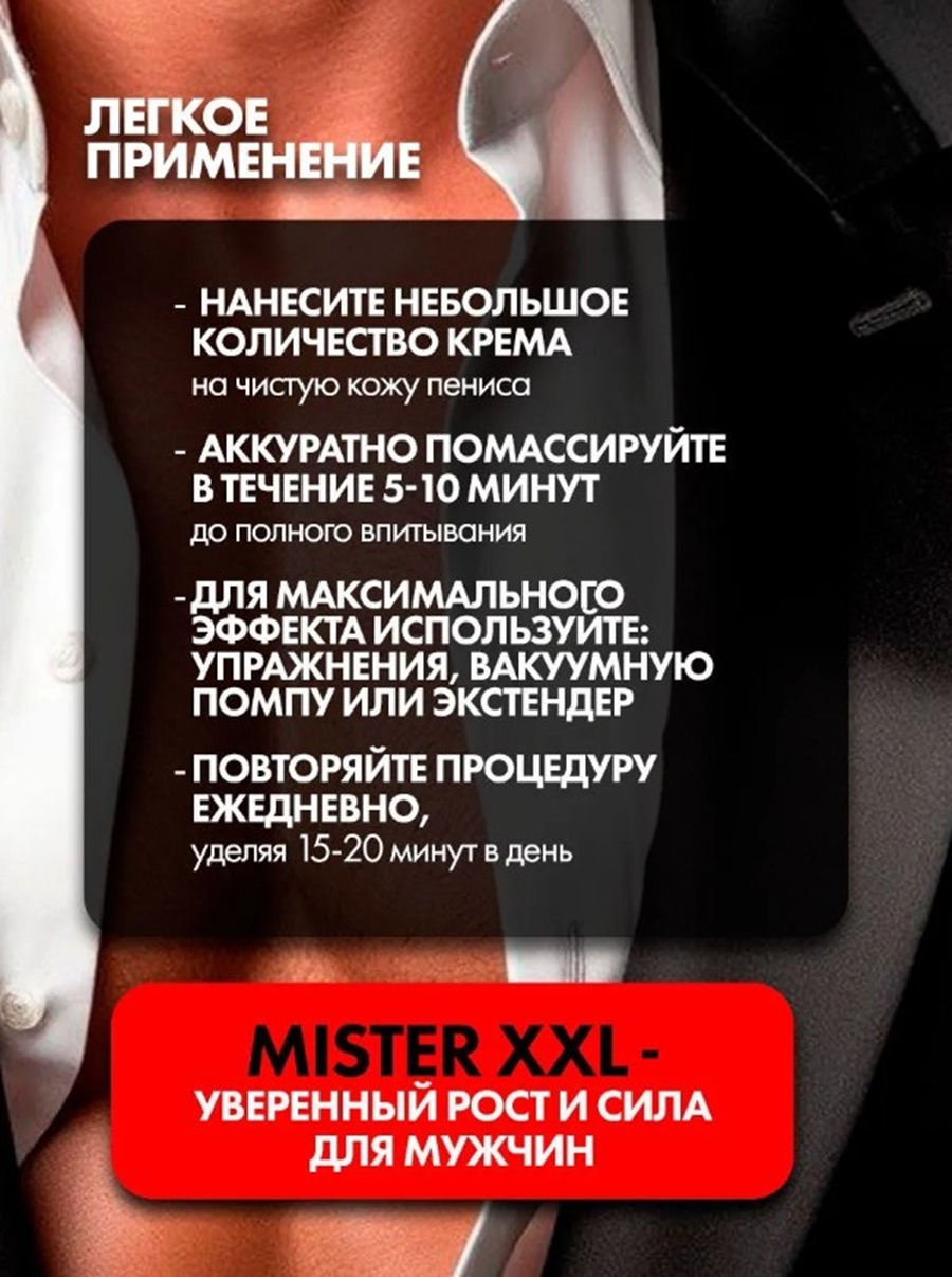 Хотите почувствовать уверенность и комфорт в интимной жизни? Крем 'Mister XXL' станет вашим надежным помощником на пути к желаемому результату. Специальная формула разработана для мужчин, стремящихся улучшить свои природные данные.