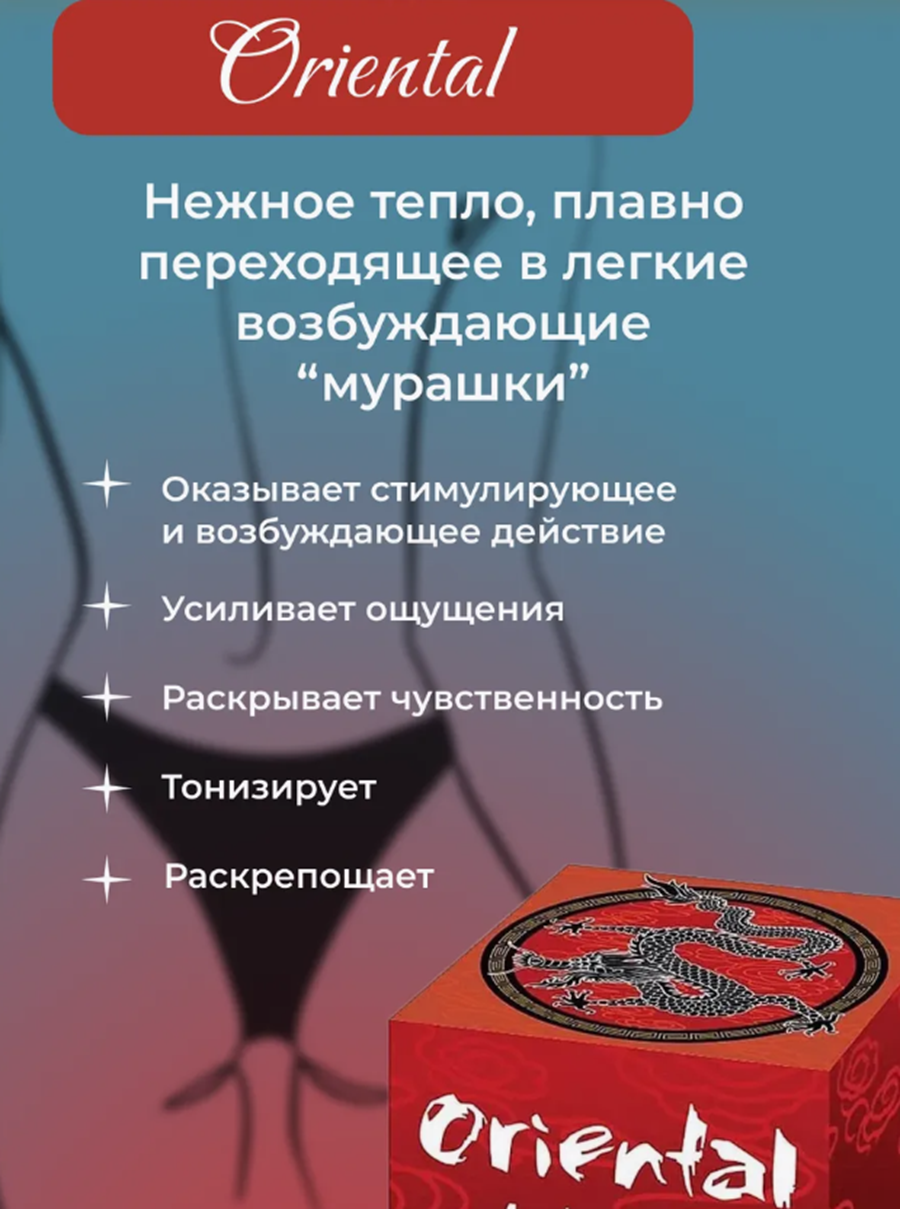 Откройте для себя уникальный крем Oriental, который подарит вам незабываемые ощущения благодаря своему охлаждающе-разогревающему эффекту. Этот продукт создан для тех, кто ценит комфорт и качество в интимной косметике. Он идеально подходит для создания романтической атмосферы и добавления новых ощущений в вашу жизнь.
