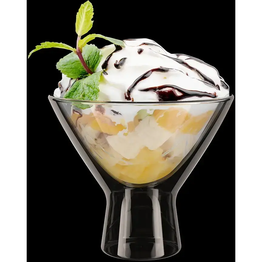Стеклянная креманка с инновационными двойными стенками сохраняет холод мороженого и свежесть фруктовых композиций в 2 раза дольше. Элегантный дизайн с плавными изгибами превратит обычный десерт в шедевр ресторанного уровня.