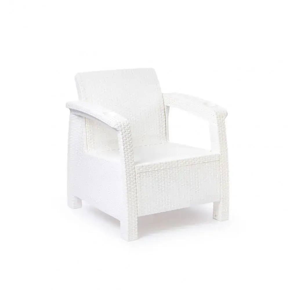 Элегантное белое кресло с плетеной текстурой — идеальное сочетание стиля и практичности для вашего участка. Устойчивый к погодным условиям пластик и продуманная конструкция обеспечат комфорт на долгие годы.