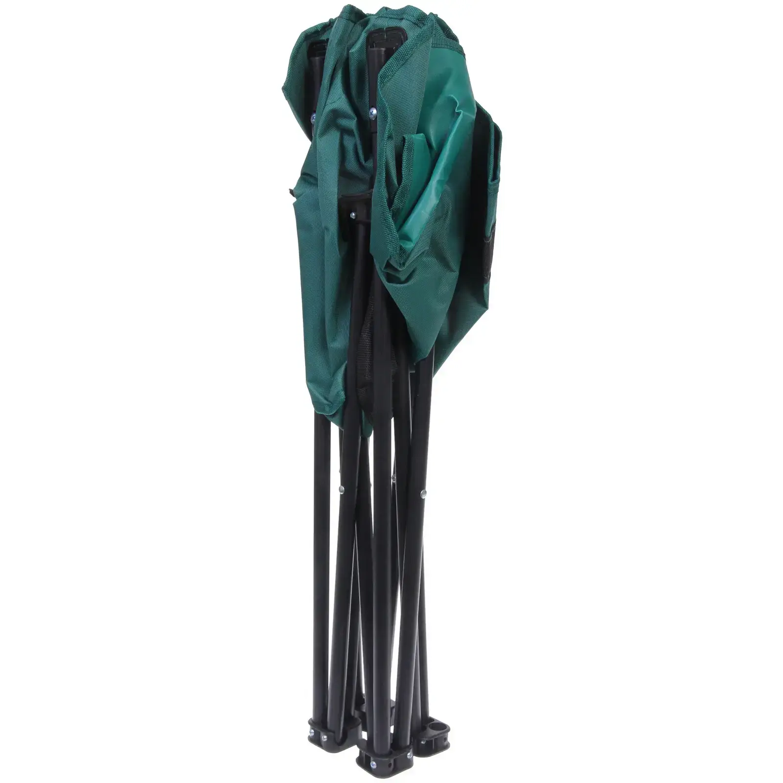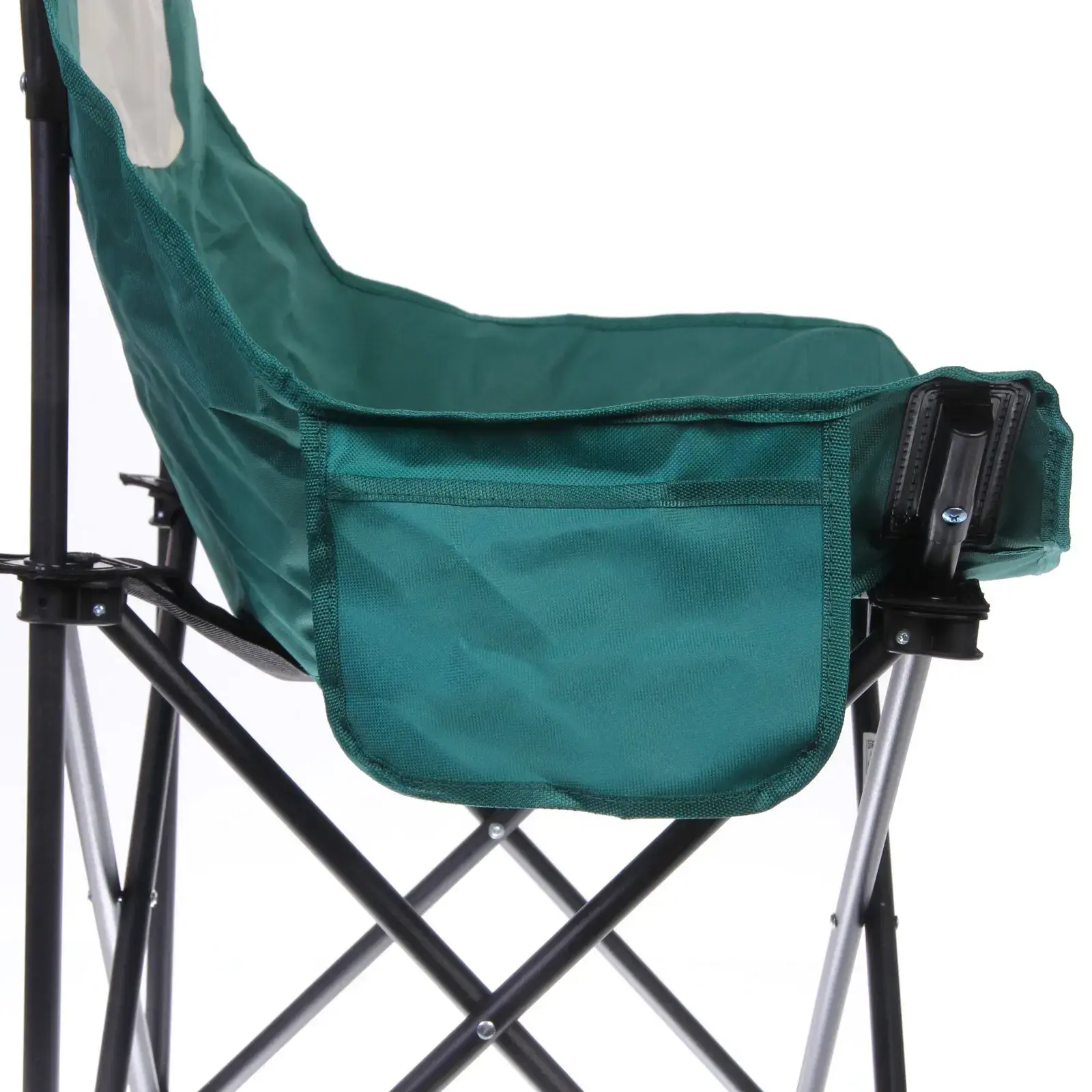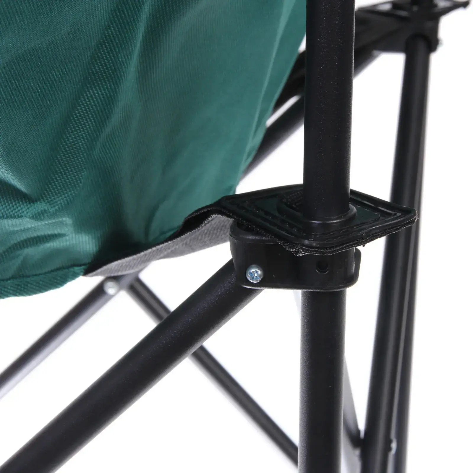 Кресло выдерживает нагрузку до 100 кг, что делает его подходящим для большинства пользователей. Обивка из прочного текстиля в зеленом цвете не только стильно выглядит, но и устойчива к внешним воздействиям. Металлический каркас обеспечивает надежность и долговечность, а боковой карман позволяет удобно хранить мелкие вещи, такие как телефон или напитки.