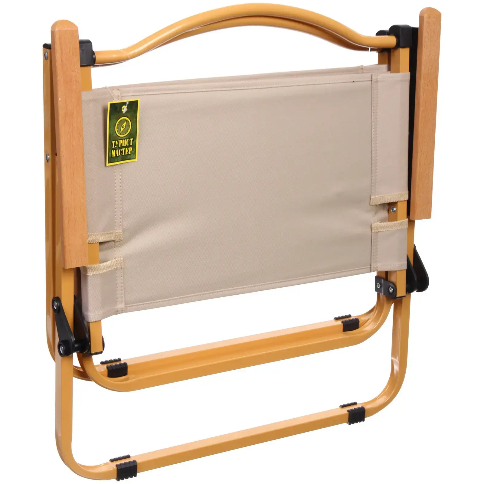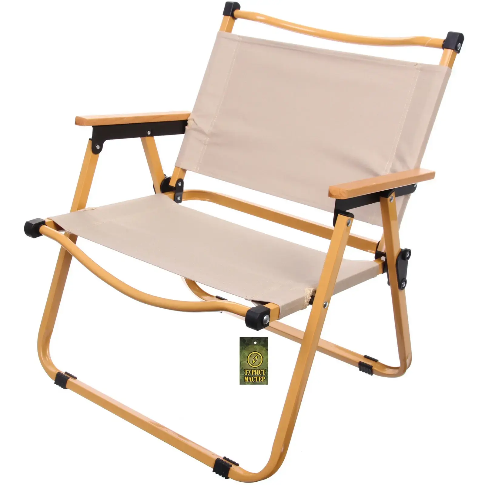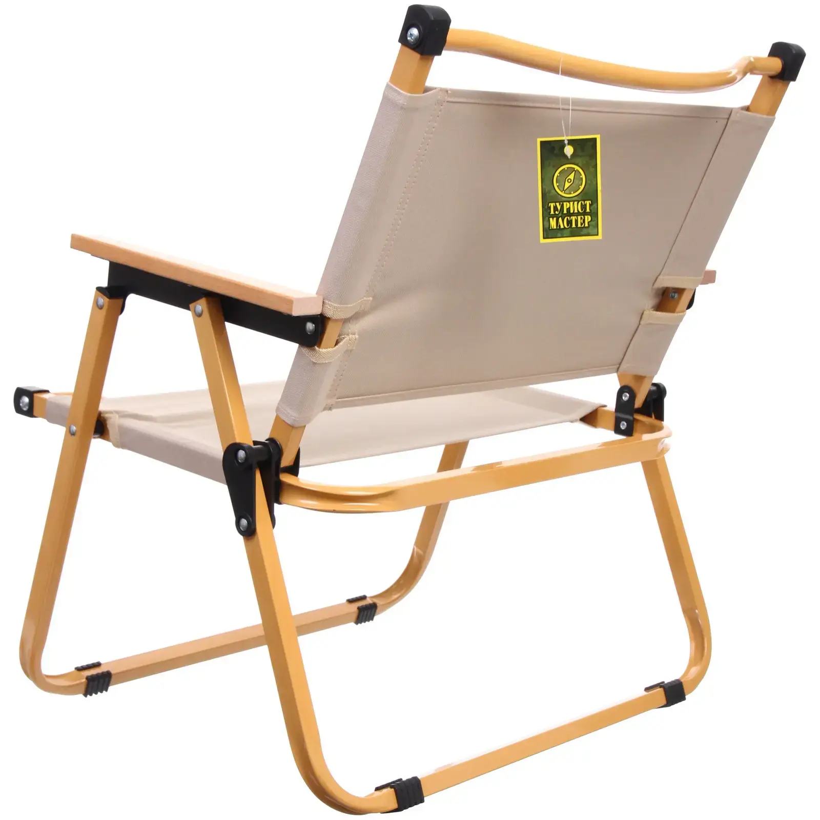 Складное кресло с подлокотниками — идеальный выбор для активного отдыха на свежем воздухе. Оно сочетает в себе прочный металлический каркас и мягкую обивку из бежевой ткани, что обеспечивает максимальный комфорт во время использования. Это кресло станет вашим надежным спутником на пикниках, рыбалке или кемпингах.