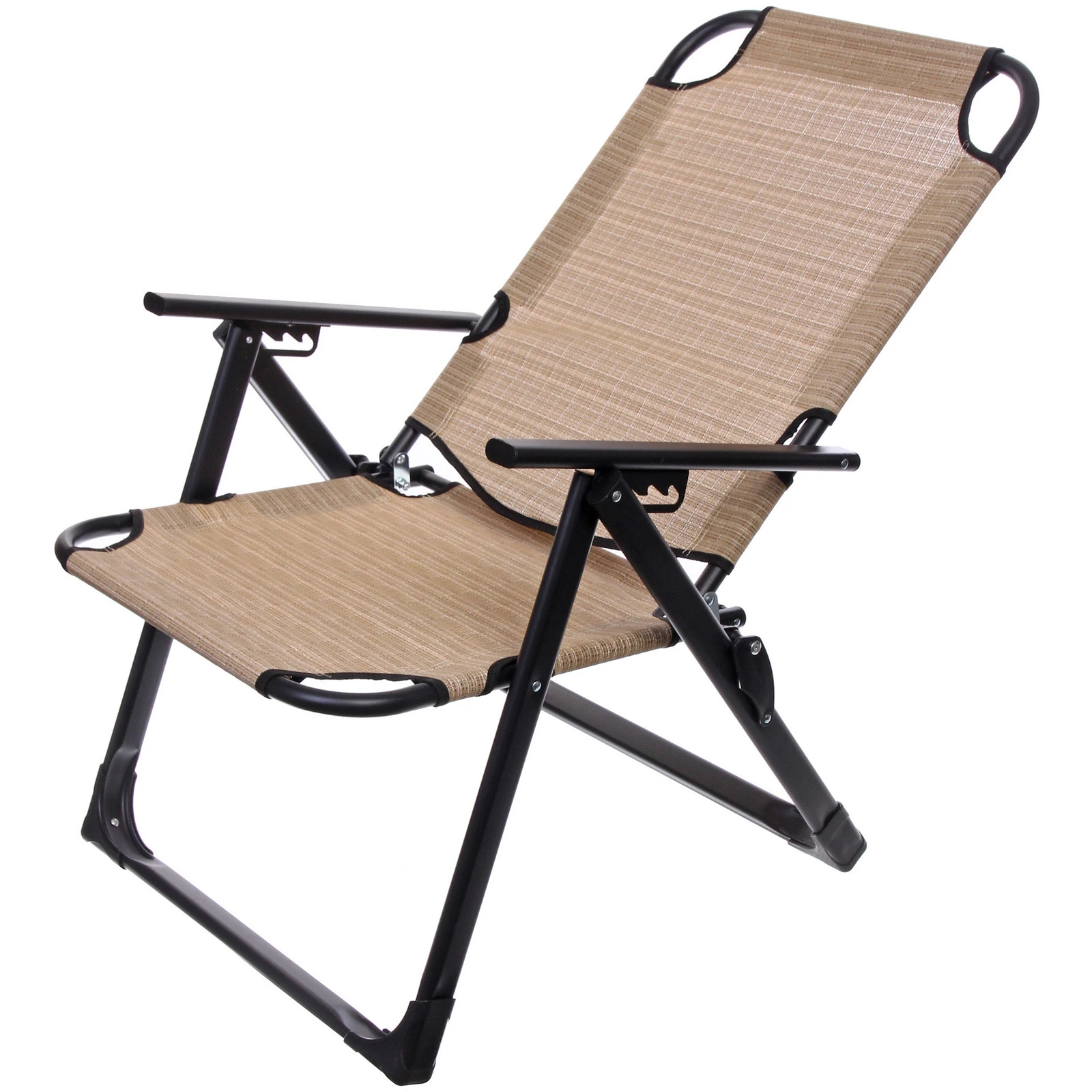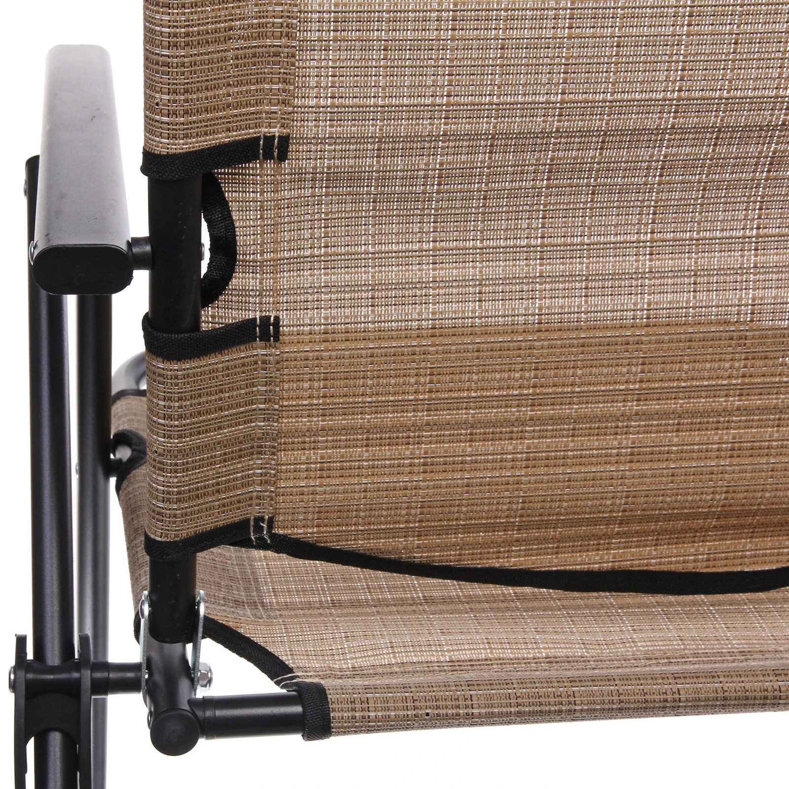 Каркас выполнен из металла, что обеспечивает устойчивость и долговечность конструкции. Сиденье и спинка изготовлены из полиэстера с плетеной текстурой, устойчивой к повседневному использованию. Прочные соединения и надежный механизм фиксации позволяют безопасно менять положение спинки.