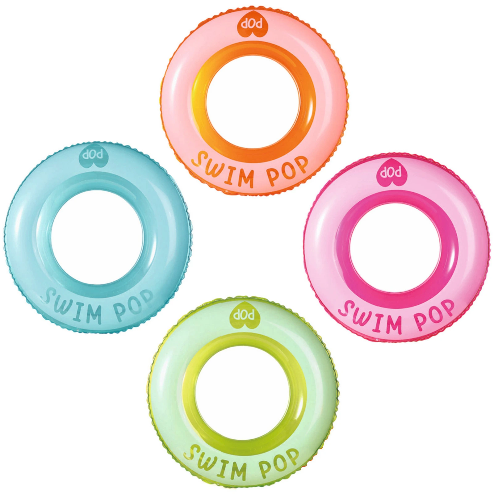 - Стильный дизайн – круг украшен современной надписью «SWIM POP» и фирменным логотипом, что делает его не просто функциональным аксессуаром, но и модным элементом пляжного образа.