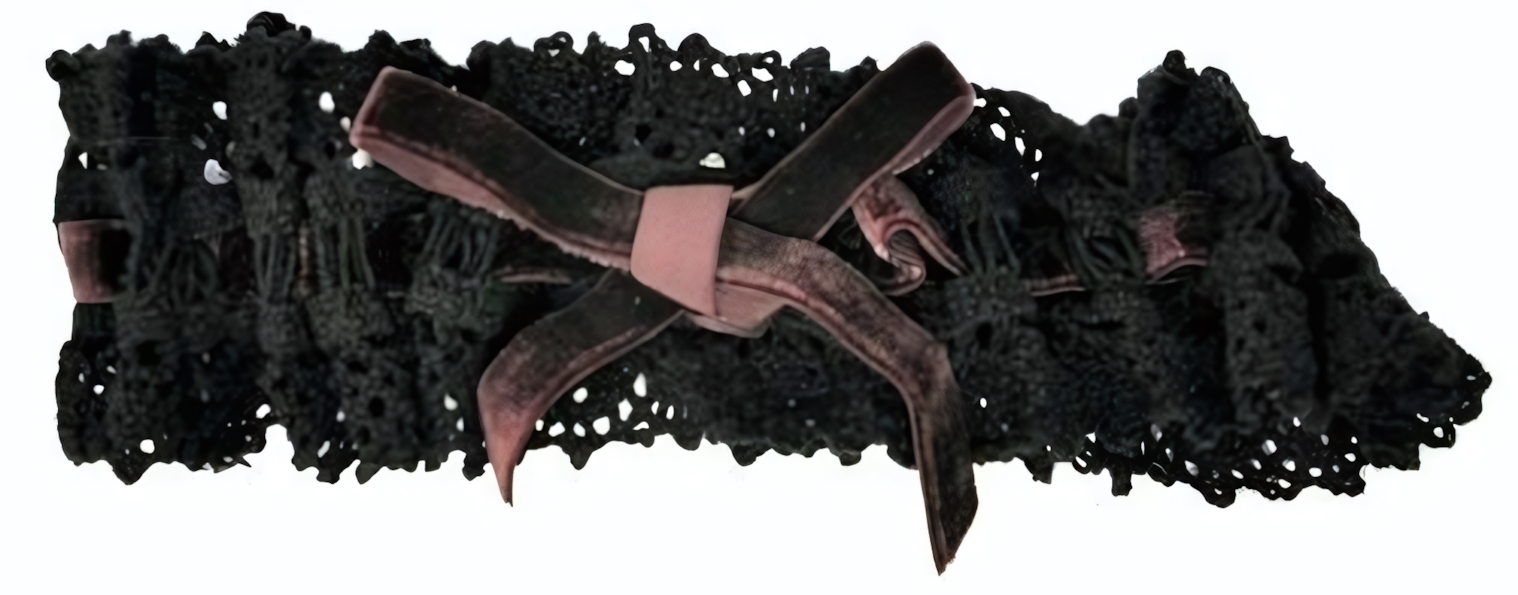 - Изысканный дизайн: Подвязка выполнена из черного ажурного кружева с волнистым краем, что создает визуальный объем и привлекает внимание. Декоративный бант из бархатистой ленты служит изящным акцентом.