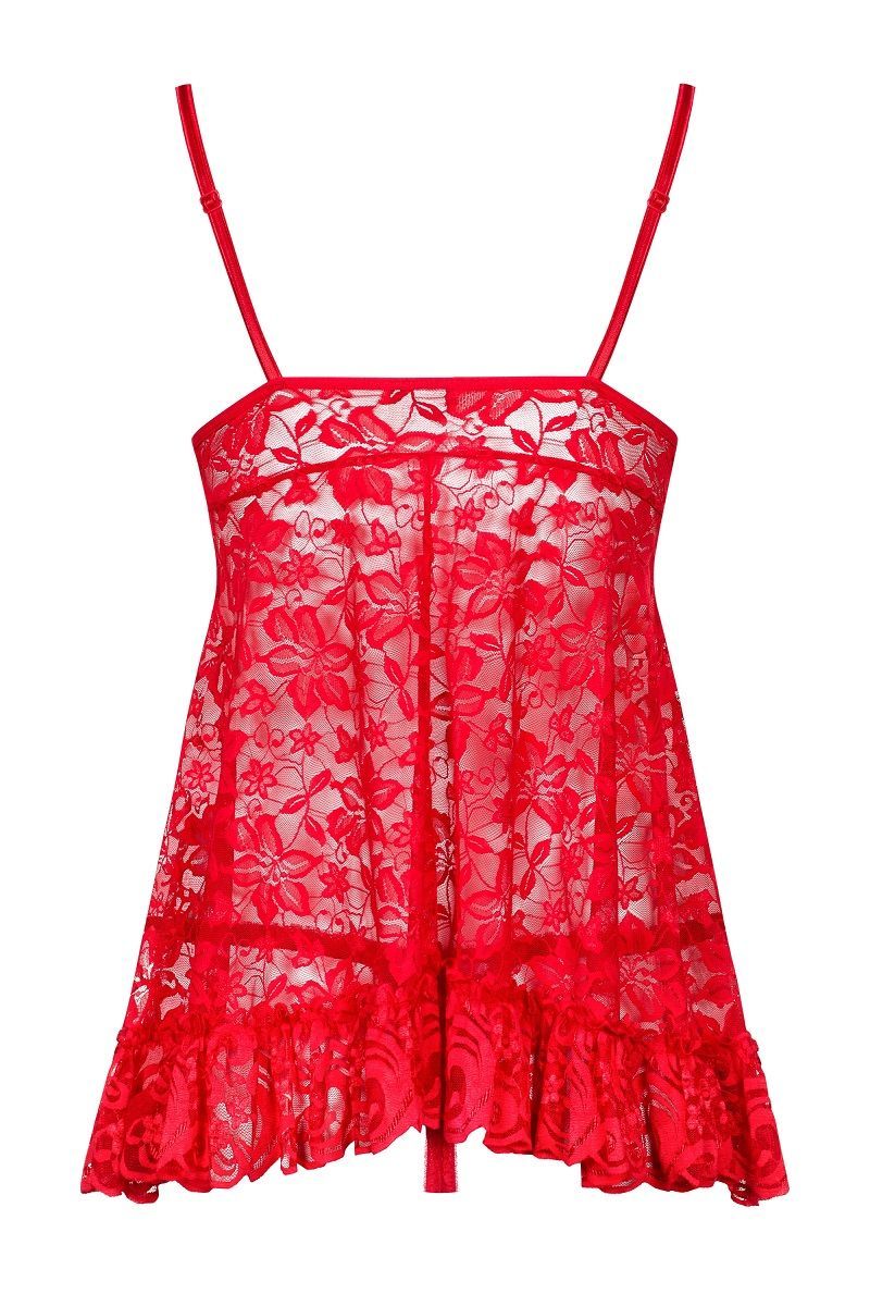 Бэби-долл выполнен из качественного кружева с цветочным узором, которое мягко облегает фигуру, создавая эффектную и в то же время комфортную посадку. Модель отличается несколькими ключевыми элементами: