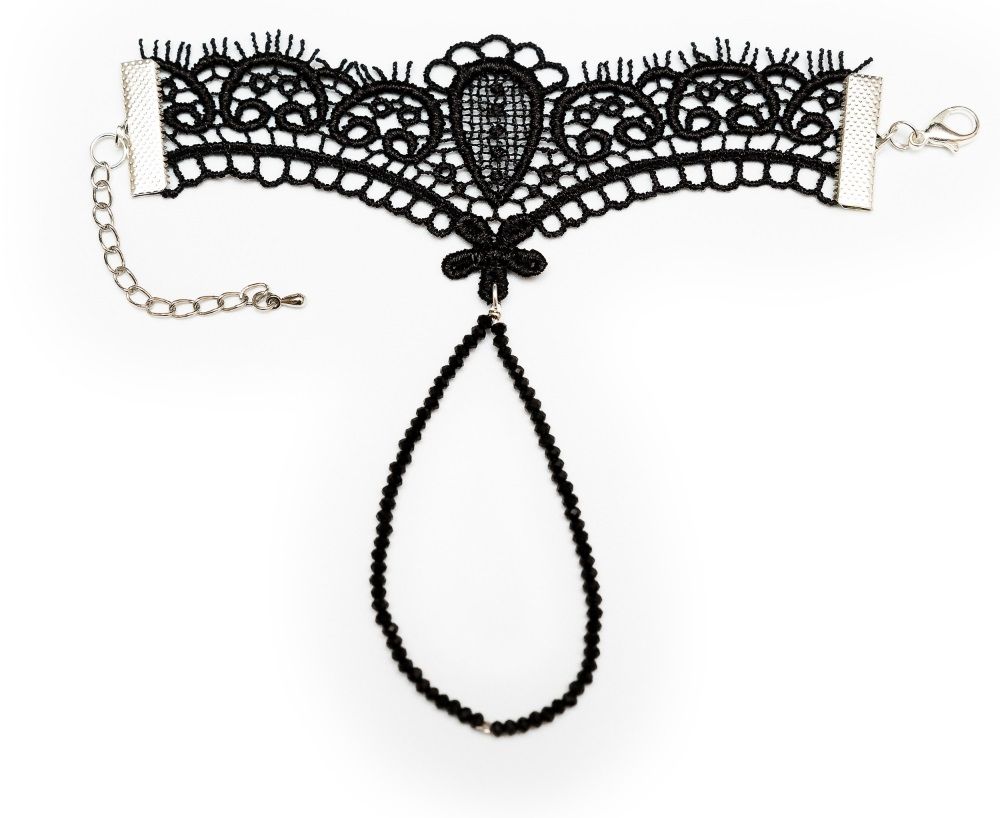 Браслет выполнен из черного ажурного кружева с изящным орнаментом в виде дуг, завитков и сетчатых вставок. Центральным элементом дизайна является каплевидная сетчатая вставка, которая придает изделию особую утонченность. К нижней части кружева прикреплена петля из черных граненых бусин, образующая элегантный овал, который надевается через пальчик, украшая кисть руки.