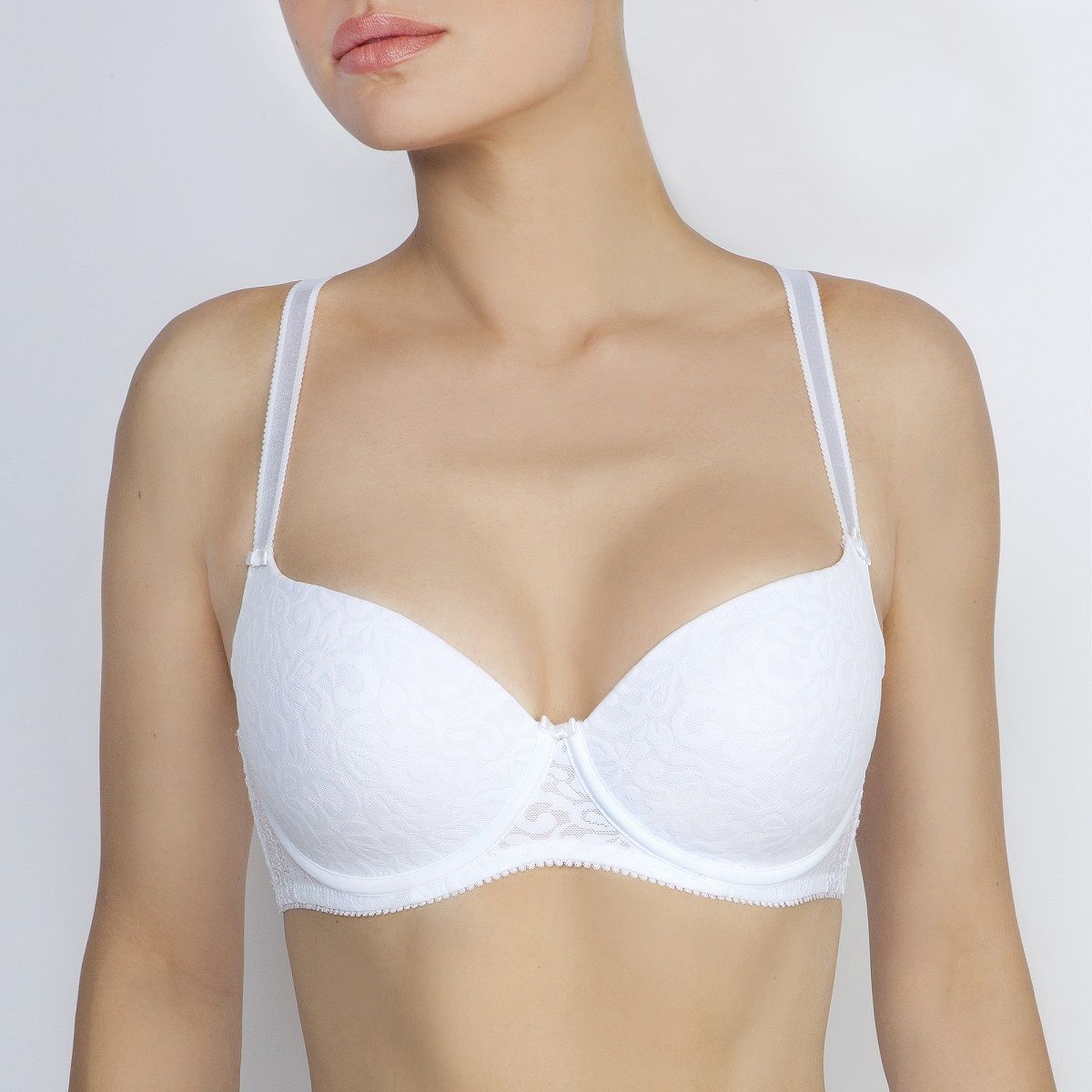 - Формованные чашки на тонком поролоне – создают гладкую, округлую форму без эффекта «пухлости», маскируют соски и обеспечивают естественный вид.