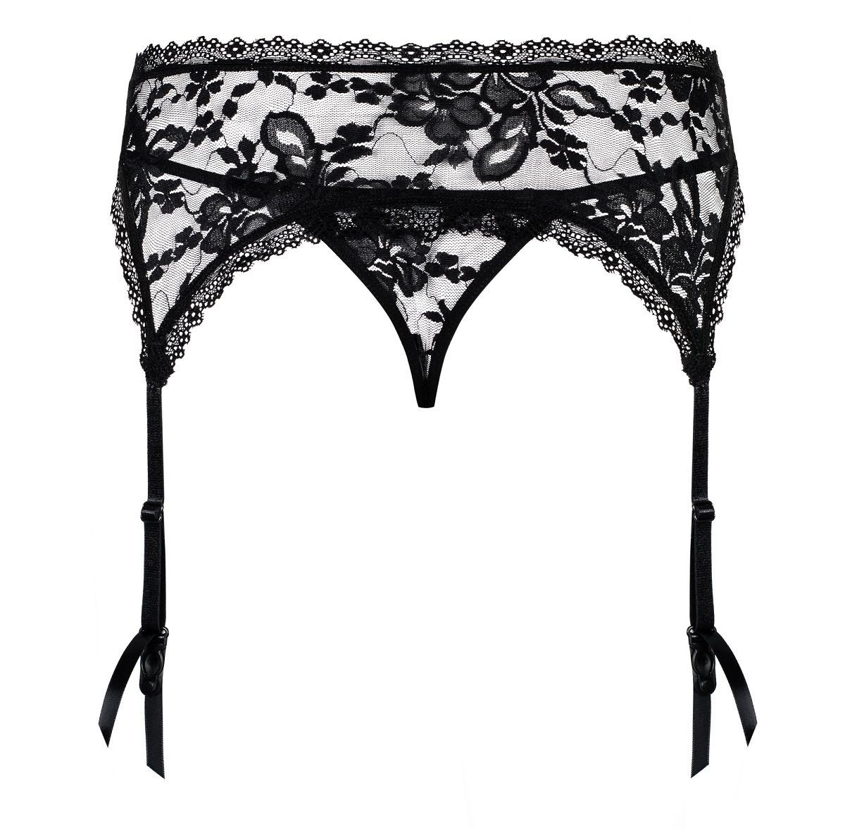 - Полный комплект: включает кружевной пояс для чулок с четырьмя подвязками и трусики-стринги с цветочным узором.