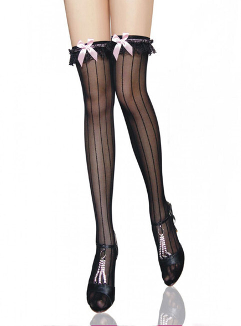 Кружевные чулки с вертикальными полосами и атласными бантами — идеальное сочетание комфорта и чувственности. Модель подчеркивает естественную красоту ног, создавая иллюзию стройности благодаря продуманному дизайну.
