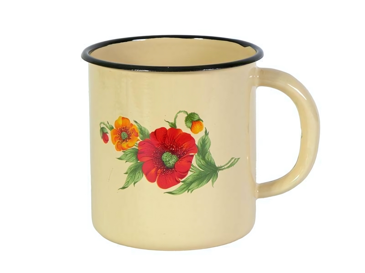 Кружка выполнена из качественной стали с эмалированным покрытием, что гарантирует её долговечность. Цвет кружки — светло-желтый с черной эмалевой обводкой, а рисунок состоит из красных и желтых цветов с зелеными листьями. Размер кружки не указан, но она достаточно вместительная для комфортного использования.