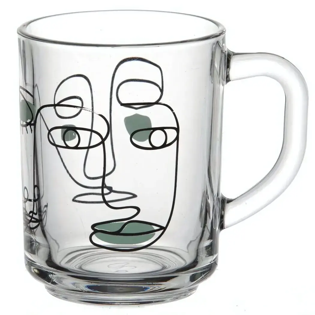 Стеклянная кружка объемом 250мл с оригинальным дизайном 'Фейсес' станет вашим любимым аксессуаром для утреннего кофе. Черно-зеленые линии, формирующие абстрактные лица, создают особое настроение и привлекают взгляды.