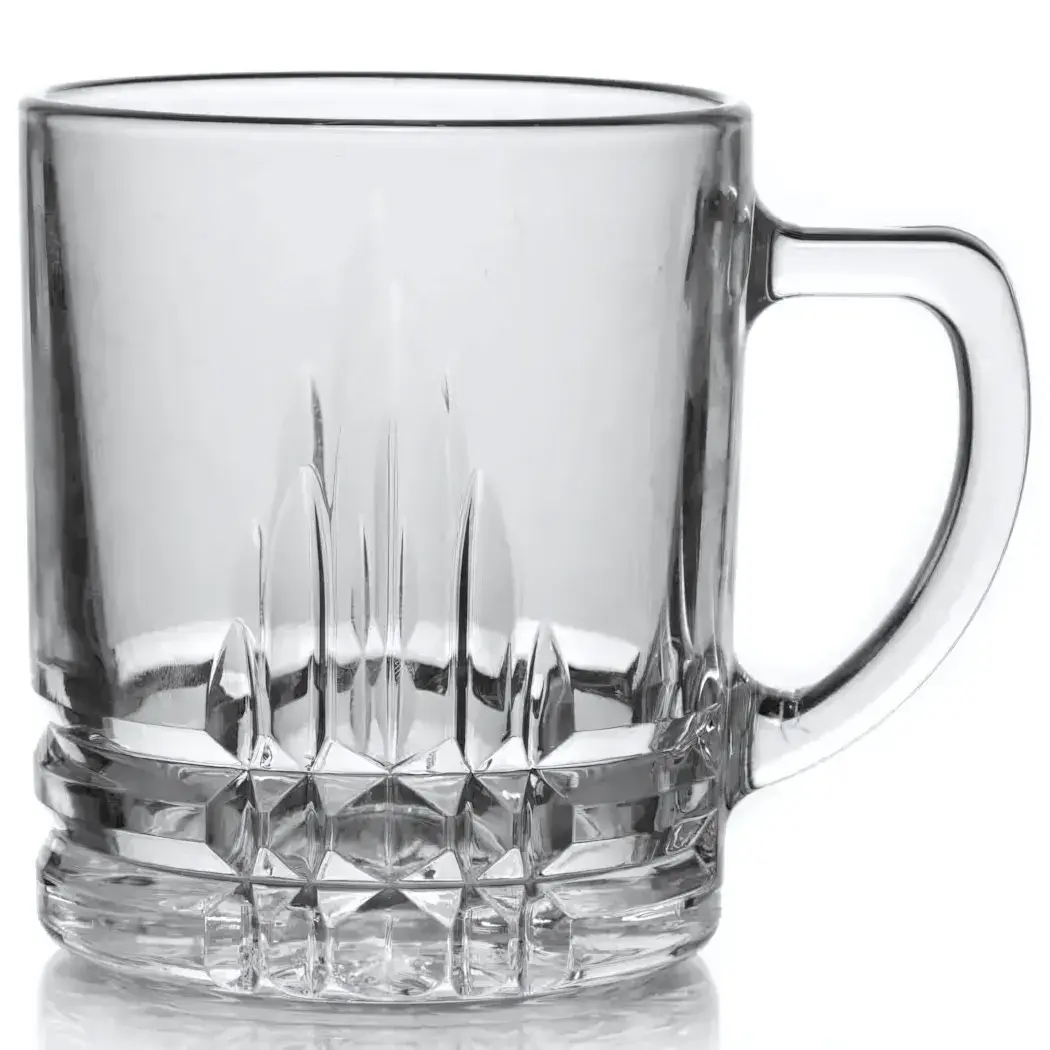 Объём кружки составляет 280мл, что идеально подходит для стандартной порции напитка. Прозрачный цвет и рифление на нижней части создают эффект звездчатого узора, добавляя изысканности. Размеры кружки оптимальны для хранения в кухонных шкафах и на столах.