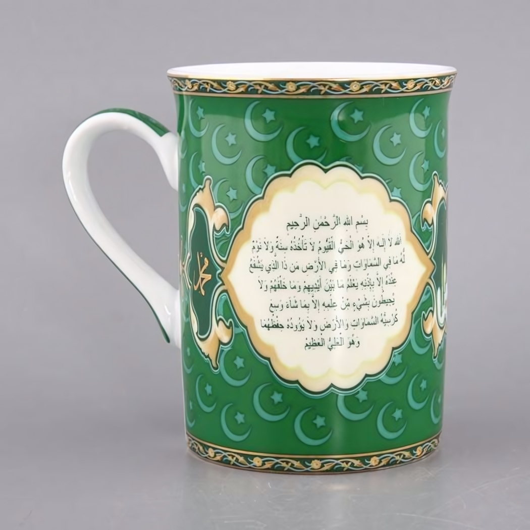 Кружка «Аятуль-Курси» сочетает изысканный внешний вид и глубокий смысл, делая каждое чаепитие особенным. Зеленый фон с золотыми узорами и арабской вязью создает атмосферу умиротворения, а качественный фарфор гарантирует долговечность использования.