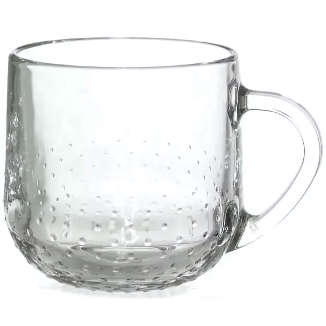 Прозрачная кружка объёмом 300 мл с утолщённым дном и рельефным узором из мелких выпуклых точек создаёт ощущение качества и надёжности при каждом использовании. Её лаконичный дизайн легко впишется в любой интерьер кухни или офиса, а комфортная ручка обеспечивает удобный захват.