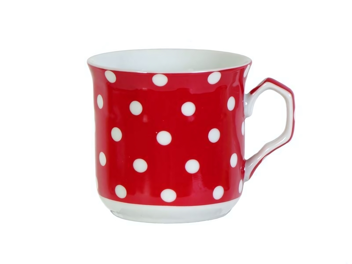 Кружка имеет цилиндрическую форму с небольшим выступом для ручки, что обеспечивает комфортное удержание. Размеры кружки стандартные, что делает её универсальной для любого стиля сервировки. Красный цвет с белыми горошками добавляет игривости и оригинальности, что делает её отличным подарком для друзей и близких.