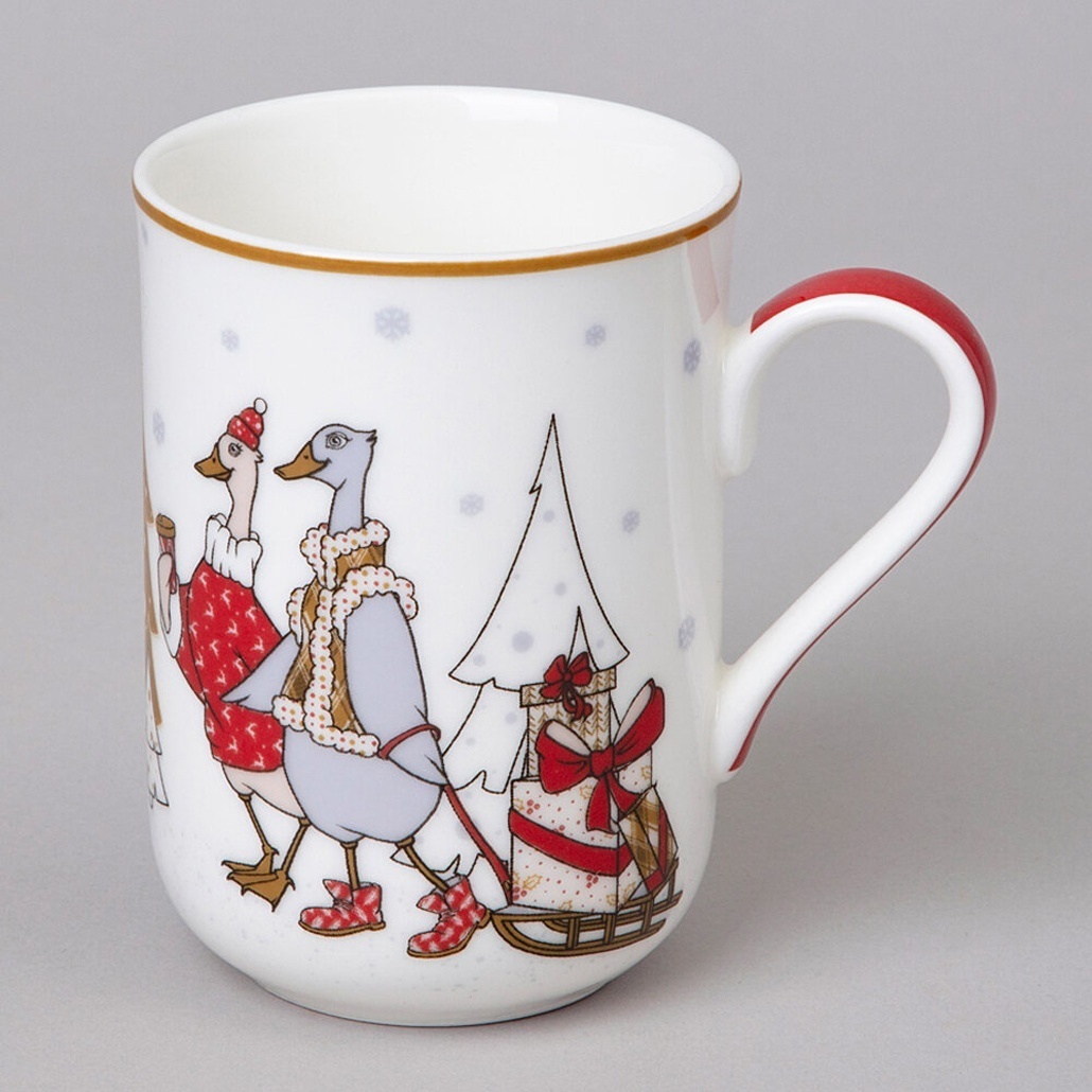 Эта фарфоровая кружка объемом 320 мл идеально подойдет для наслаждения горячими напитками в холодное время года. Создана специально для любителей новогодних праздников и уютных вечеров, она обязательно добавит праздничного настроения. Круглая ручка обеспечивает комфортный захват, а изящный дизайн с изображением уток в зимней одежде и елками превратит каждое чаепитие в особенное событие.