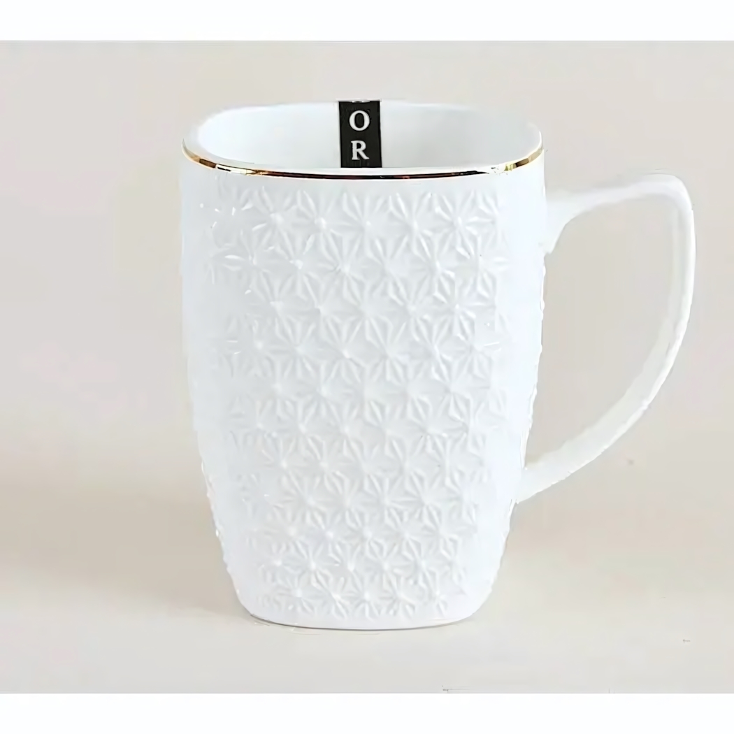 Рельефный геометрический узор создаёт тактильно приятную поверхность и эффектный визуальный акцент. Золотистая окантовка добавляет нотку роскоши, превращая обычную чашку в элемент сервировки. Универсальный белый цвет гармонично впишется в любую кухонную палитру.