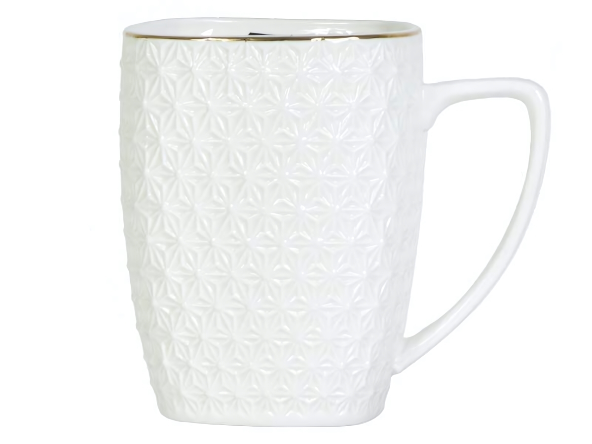 Эта кружка объемом 340 мл создана для тех, кто ценит гармоничное сочетание изысканного дизайна и практичности. Белый фарфор с утончённой золотистой окантовкой по краю придает изделию благородный вид, а рельефный геометрический узор с повторяющимися звёздчатыми формами делает кружку стильным элементом сервировки.