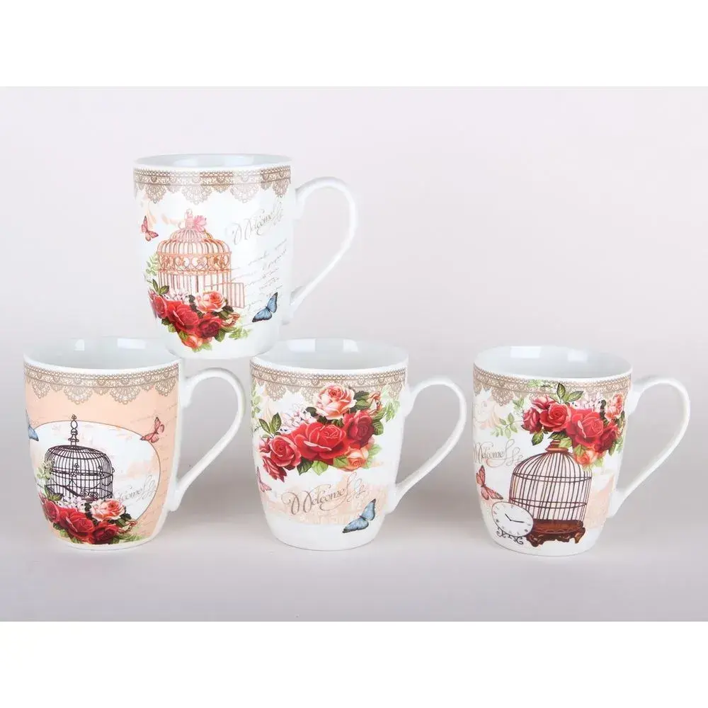 Керамическая кружка объёмом 350 мл с изысканным цветочным орнаментом создаст особую атмосферу во время утреннего кофе или вечернего чая. Белоснежная основа с ажурными красными розами, птицами и бабочками добавит нотку изящества вашему столу.
