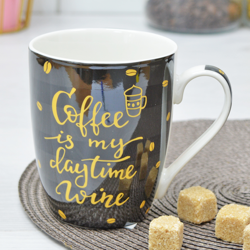 Кружка предназначена для ежедневного использования и подходит как для дома, так и для офиса. Ее стильный черный цвет с золотистой надписью «Coffee is my daytime Wine» добавляет изюминку в любой интерьер. Вы можете использовать ее как для утреннего кофе, так и для вечернего чая с друзьями.