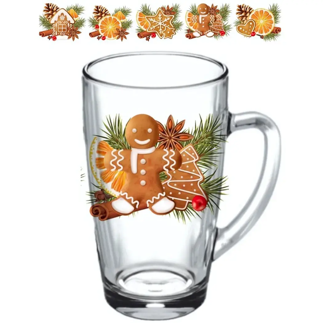 Погрузитесь в атмосферу праздника с нашей кружкой объемом 400 мл. Эта кружка станет не только стильным дополнением вашего стола, но и отличным подарком для близких. Прямые линии и прозрачный материал придают ей элегантный вид, а уникальный декор с изображением пряничного человечка, корицы и еловых веток создаёт праздничное настроение.