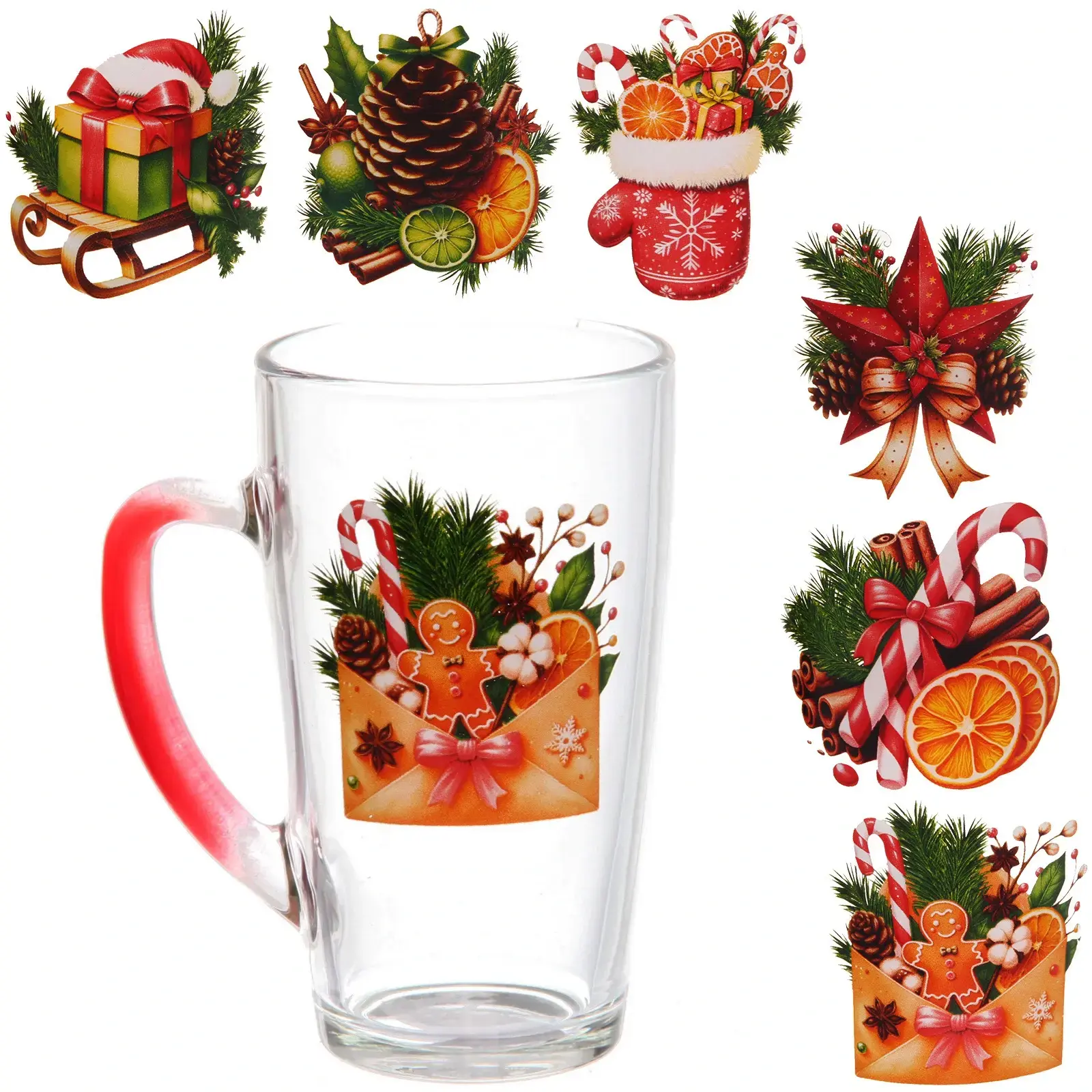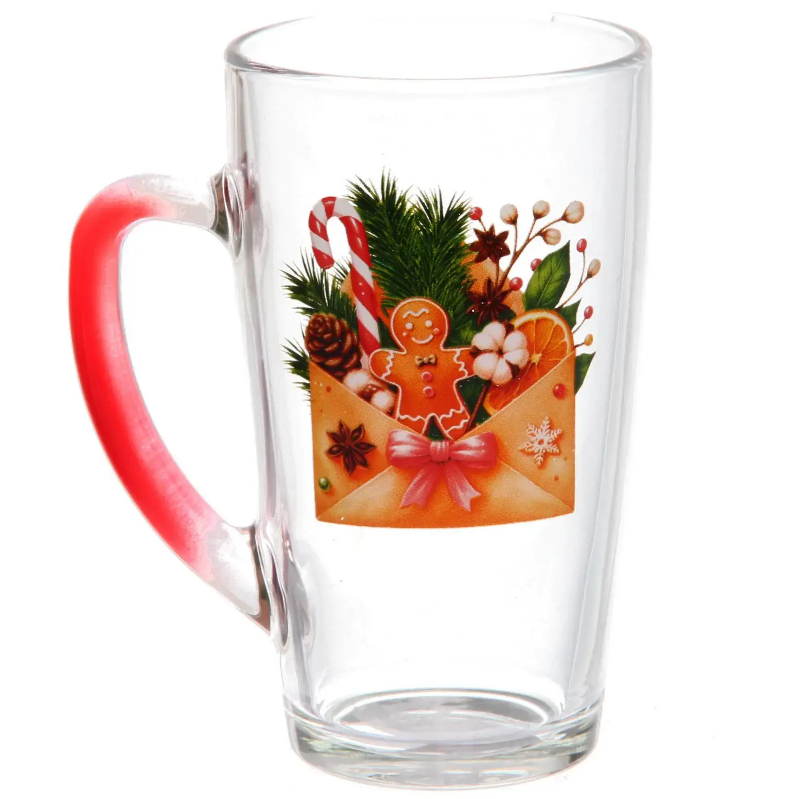 Кружка стеклянная 400мл, 'Зимняя фантазия', ручка красная, новогодний дизайн