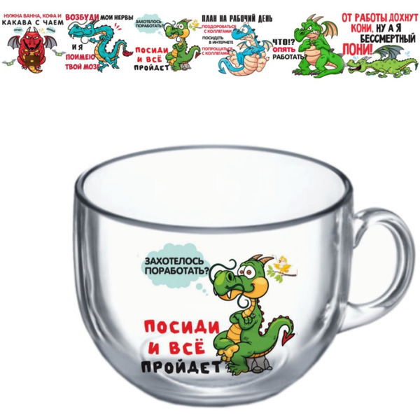 Кружка имеет круглую форму и гладкую поверхность, что делает ее приятной на ощупь. На ней изображен мультяшный дракон с текстами, которые поднимают настроение и вдохновляют на работу. Размер кружки позволяет наливать достаточно напитка, чтобы наслаждаться им в течение долгого времени.