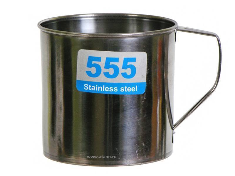 Кружка имеет цилиндрическую форму с открытым верхом и прочную ручку, что делает ее удобной в использовании. Размеры кружки не указаны, но она достаточно компактна для переноски и хранения. Наклейка с текстом «555» и надписью «Stainless steel» добавляет уникальности и подчеркивает качество материала.